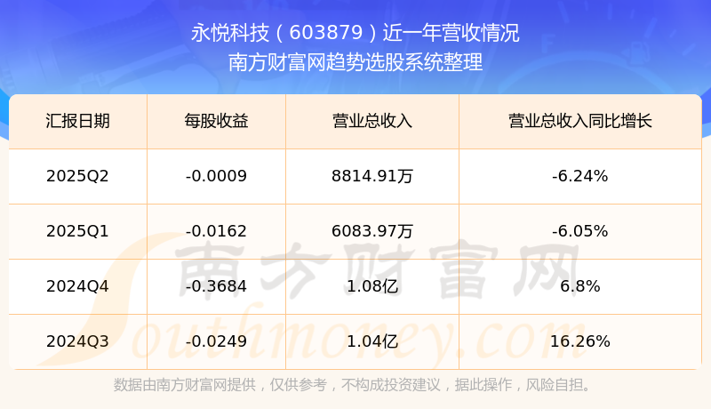 A股上市公司永悅科技(代碼:603879)發(fā)布2025年第二季度財(cái)報(bào),公司2025年第二季度歸屬于上市公司股東的凈利潤(rùn)為-33.79萬元,凈利潤(rùn)同比增長(zhǎng)97.35%,環(huán)比增長(zhǎng)94.21%。
