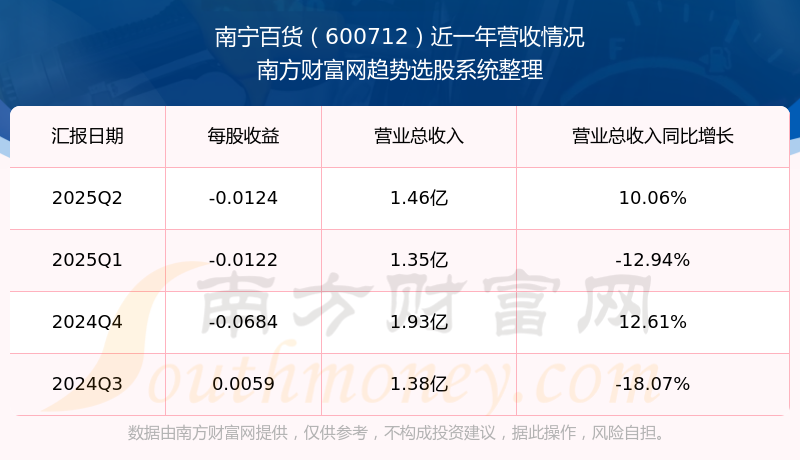 南寧百貨2025年第二季度顯示,公司主營(yíng)收入1.46億元,同比10.06%;歸母凈利潤(rùn)-675.31萬(wàn)元,同比-2799.94%;扣非凈利潤(rùn)-1326.85萬(wàn)元,同比-3682.84%;