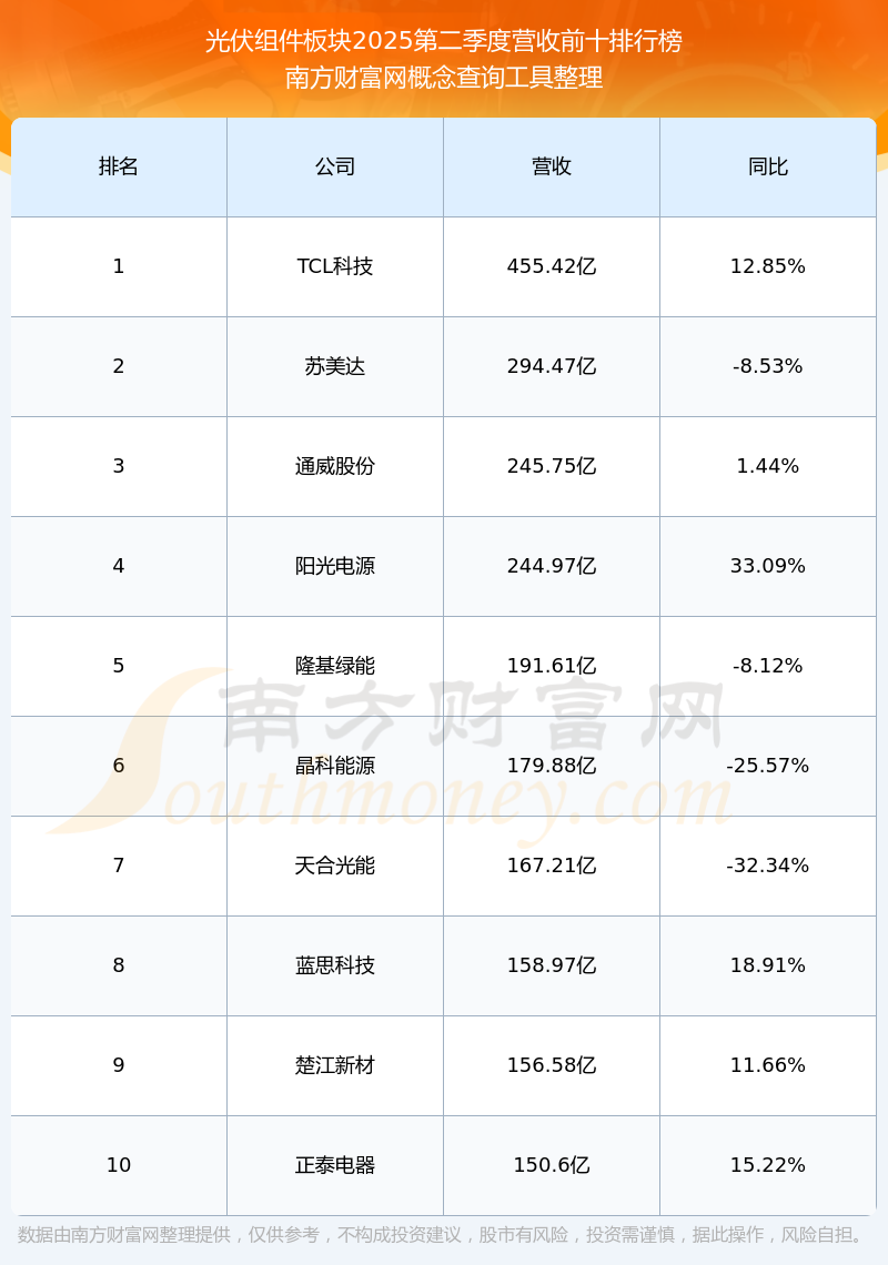 按照南方財富網(wǎng)概念查詢工具統(tǒng)計,該股所屬板塊為光伏組件板塊,該板塊共有109只股票,天合光能2025第二季度營收在該板塊中排名為第7名,該板塊2025第二季度營收排名前十的股票如下表: