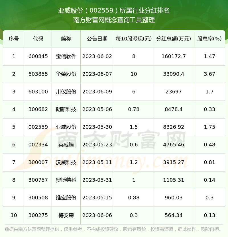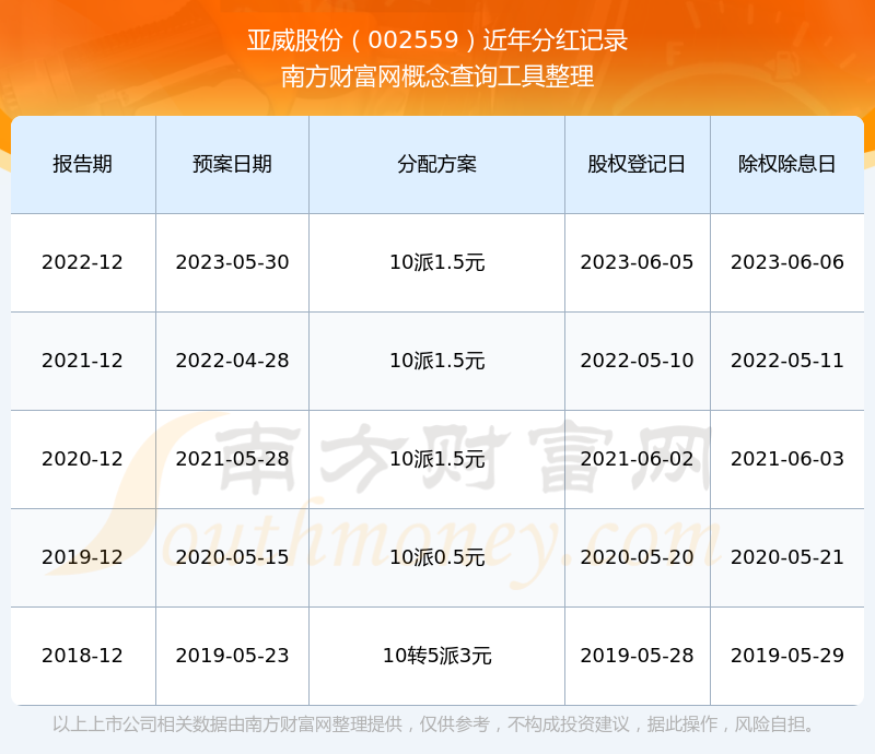 亞威股份最新一次公布的分紅方案為10派1.5元。本次權(quán)益分派股權(quán)登記日為2023年6月5日,除權(quán)除息日為2023年6月6日,派息日為2023年6月6日。