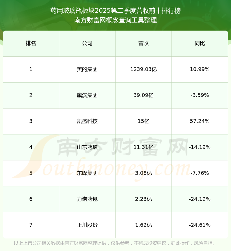 按照南方財富網(wǎng)概念查詢工具統(tǒng)計,該股所屬板塊為藥用玻璃瓶板塊,該板塊共有7只股票,正川股份2025第二季度營收在該板塊中排名為第7名,該板塊2025第二季度營收排名前十的股票如下表: