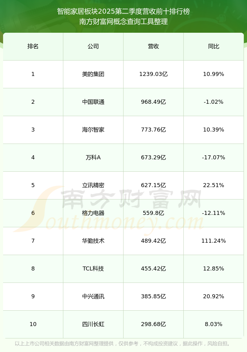 按照南方財(cái)富網(wǎng)概念查詢工具統(tǒng)計(jì),該股所屬板塊為智能家居板塊,該板塊共有299只股票,好太太2025第二季度營(yíng)收在該板塊中排名為第196名,該板塊2025第二季度營(yíng)收排名前十的股票如下表: