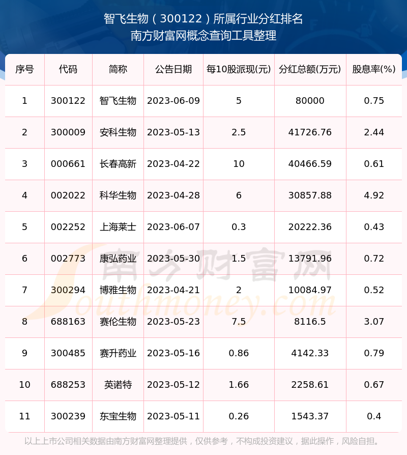 按照南方財富網(wǎng)趨勢選股系統(tǒng)統(tǒng)計,智飛生物所屬行業(yè)為生物制品行業(yè),生物制品行業(yè)分紅排名情況如下表:
