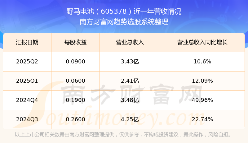 財報顯示,2025年第二季度野馬電池營收3.43億元,同比增長10.6%,凈利潤1865.23萬元,同比增長-57.77%。