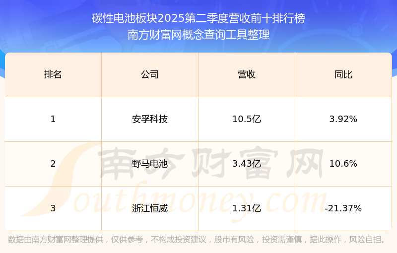 按照南方財富網(wǎng)概念查詢工具統(tǒng)計,該股所屬板塊為碳性電池板塊,該板塊共有3只股票,野馬電池2025第二季度營收在該板塊中排名為第2名,該板塊2025第二季度營收排名前十的股票如下表: