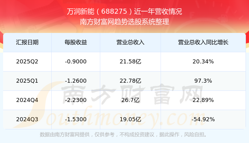 萬(wàn)潤(rùn)新能發(fā)布2025年第二季度財(cái)報(bào)。實(shí)現(xiàn)總營(yíng)收21.58億元,同比增長(zhǎng)20.34%;扣非凈利潤(rùn)同比增長(zhǎng)30.97%至-1.93億元。