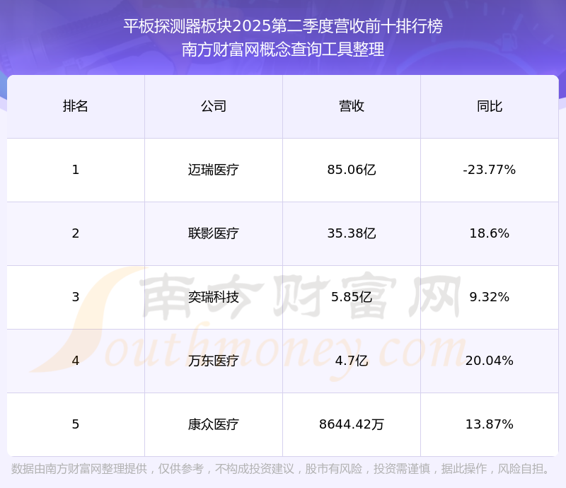 按照南方財(cái)富網(wǎng)概念查詢(xún)工具統(tǒng)計(jì),該股所屬板塊為平板探測(cè)器板塊,該板塊共有5只股票,奕瑞科技2025第二季度營(yíng)收在該板塊中排名為第3名,該板塊2025第二季度營(yíng)收排名前十的股票如下表: