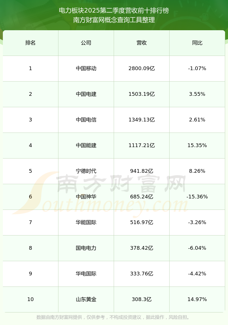 按照南方財富網(wǎng)概念查詢工具統(tǒng)計(jì),該股所屬板塊為電力板塊,該板塊共有237只股票,福能股份2025第二季度營收在該板塊中排名為第68名,該板塊2025第二季度營收排名前十的股票如下表: