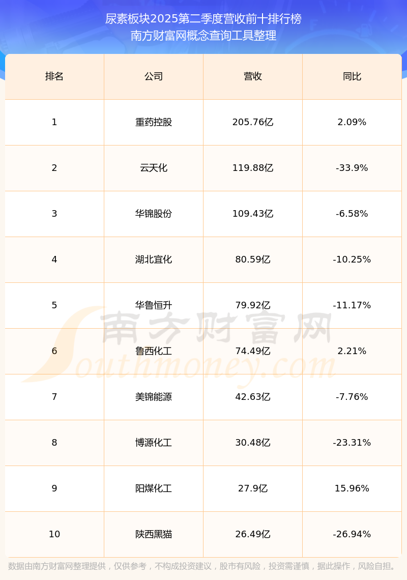 按照南方財(cái)富網(wǎng)概念查詢工具統(tǒng)計(jì),該股所屬板塊為尿素板塊,該板塊共有23只股票,陽煤化工2025第二季度營收在該板塊中排名為第9名,該板塊2025第二季度營收排名前十的股票如下表: