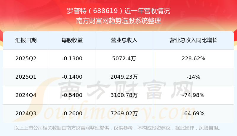 A股上市公司羅普特(代碼:688619)發(fā)布2025年第二季度財報,公司2025年第二季度歸屬于上市公司股東的凈利潤為-2275.38萬元,凈利潤同比增長19.65%,環(huán)比增長7.58%。