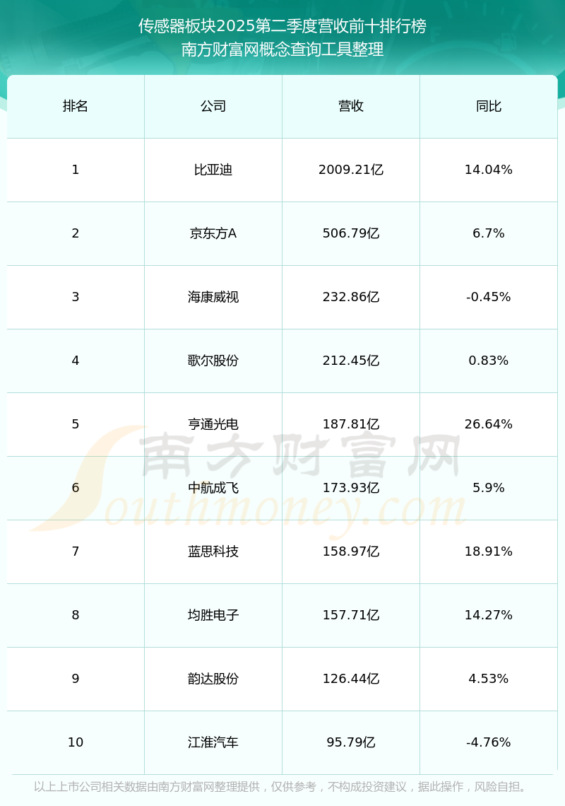 按照南方財(cái)富網(wǎng)概念查詢工具統(tǒng)計(jì),該股所屬板塊為傳感器板塊,該板塊共有177只股票,四方光電2025第二季度營(yíng)收在該板塊中排名為第119名,該板塊2025第二季度營(yíng)收排名前十的股票如下表: