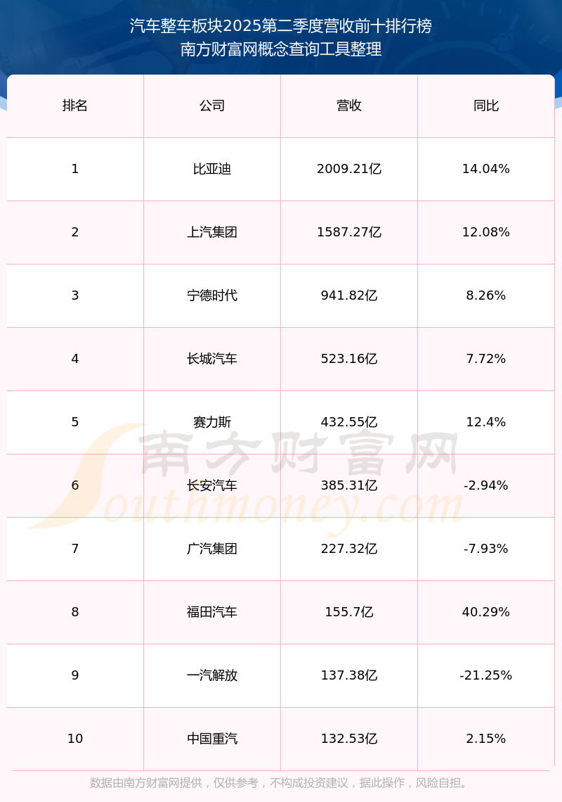 按照南方財(cái)富網(wǎng)概念查詢工具統(tǒng)計(jì),該股所屬板塊為汽車(chē)整車(chē)板塊,該板塊共有45只股票,曙光股份2025第二季度營(yíng)收在該板塊中排名為第38名,該板塊2025第二季度營(yíng)收排名前十的股票如下表:
