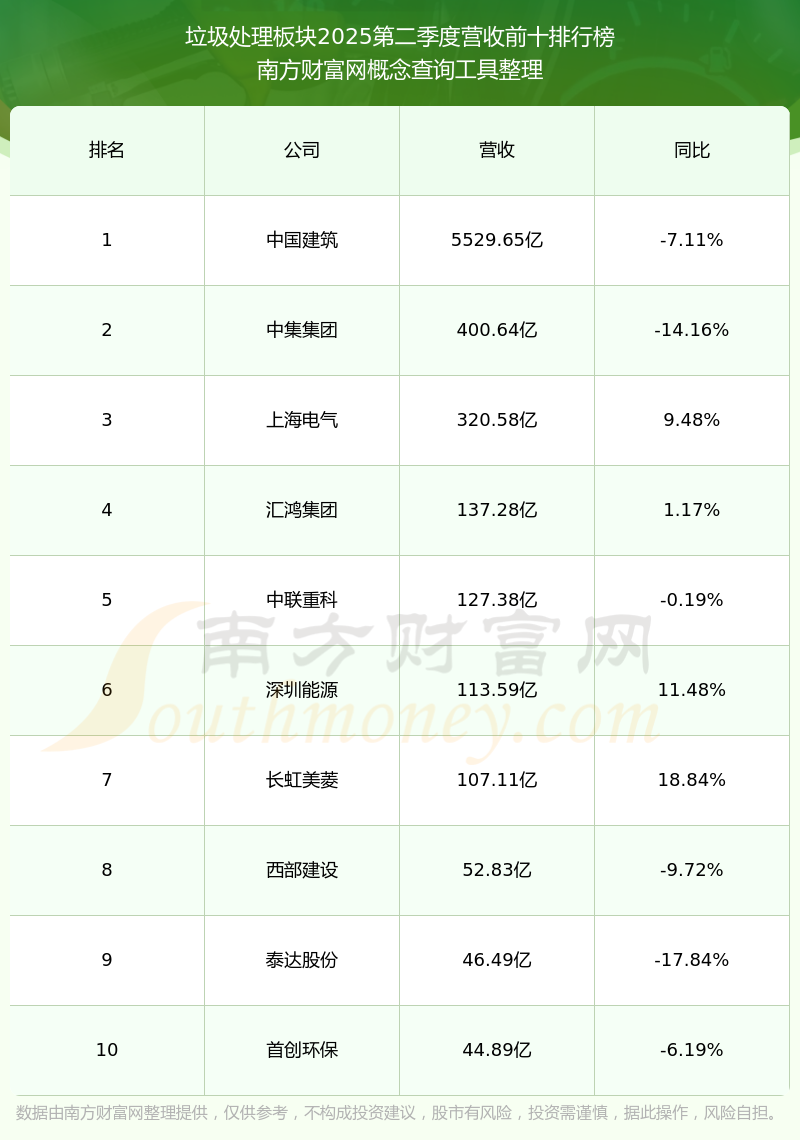按照南方財(cái)富網(wǎng)概念查詢工具統(tǒng)計(jì),該股所屬板塊為垃圾處理板塊,該板塊共有57只股票,綠色動(dòng)力2025第二季度營(yíng)收在該板塊中排名為第35名,該板塊2025第二季度營(yíng)收排名前十的股票如下表: