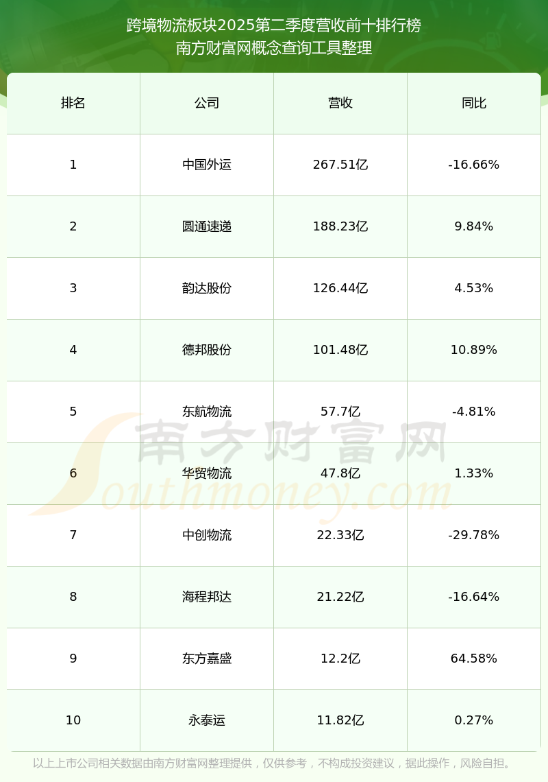 按照南方財富網概念查詢工具統計,該股所屬板塊為跨境物流板塊,該板塊共有14只股票,嘉友國際2025第二季度營收在該板塊中排名為第14名,該板塊2025第二季度營收排名前十的股票如下表: