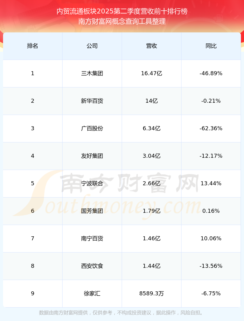 按照南方財富網(wǎng)概念查詢工具統(tǒng)計,該股所屬板塊為內(nèi)貿(mào)流通板塊,該板塊共有9只股票,物產(chǎn)中大2025第二季度營收在該板塊中排名為第9名,該板塊2025第二季度營收排名前十的股票如下表: