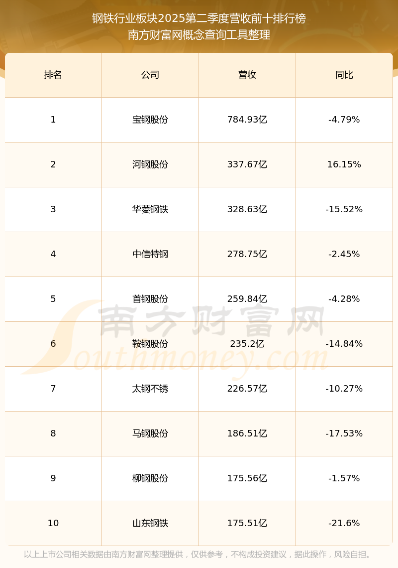 按照南方財(cái)富網(wǎng)概念查詢工具統(tǒng)計(jì),該股所屬板塊為鋼鐵行業(yè)板塊,該板塊共有41只股票,南鋼股份2025第二季度營收在該板塊中排名為第13名,該板塊2025第二季度營收排名前十的股票如下表: