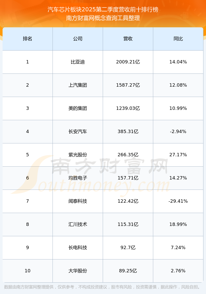 按照南方財(cái)富網(wǎng)概念查詢工具統(tǒng)計(jì),該股所屬板塊為汽車芯片板塊,該板塊共有211只股票,豪威集團(tuán)2025第二季度營收在該板塊中排名為第15名,該板塊2025第二季度營收排名前十的股票如下表: