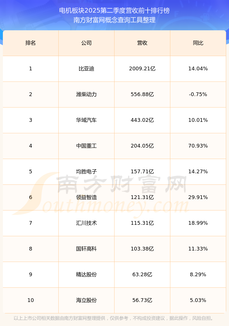 按照南方財富網概念查詢工具統(tǒng)計,該股所屬板塊為電機板塊,該板塊共有113只股票,迪貝電氣2025第二季度營收在該板塊中排名為第91名,該板塊2025第二季度營收排名前十的股票如下表: