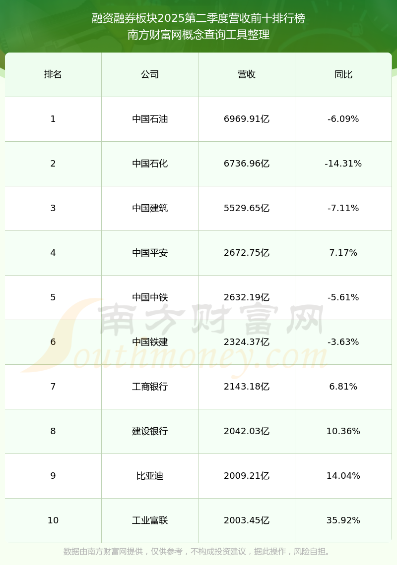按照南方財(cái)富網(wǎng)概念查詢工具統(tǒng)計(jì),該股所屬板塊為融資融券板塊,該板塊共有1581只股票,香溢融通2025第二季度營(yíng)收在該板塊中排名為第1509名,該板塊2025第二季度營(yíng)收排名前十的股票如下表: