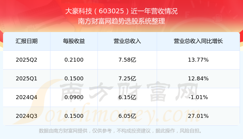 大豪科技2025年第二季度公司實現(xiàn)營業(yè)收入7.58億元,同比13.77%;歸母凈利潤2.3億元,同比33.13%。