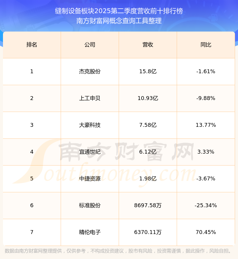 按照南方財富網(wǎng)概念查詢工具統(tǒng)計,該股所屬板塊為縫制設(shè)備板塊,該板塊共有7只股票,大豪科技2025第二季度營收在該板塊中排名為第3名,該板塊2025第二季度營收排名前十的股票如下表: