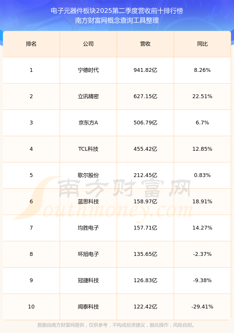 按照南方財富網(wǎng)概念查詢工具統(tǒng)計,該股所屬板塊為電子元器件板塊,該板塊共有160只股票,泰晶科技2025第二季度營收在該板塊中排名為第132名,該板塊2025第二季度營收排名前十的股票如下表: