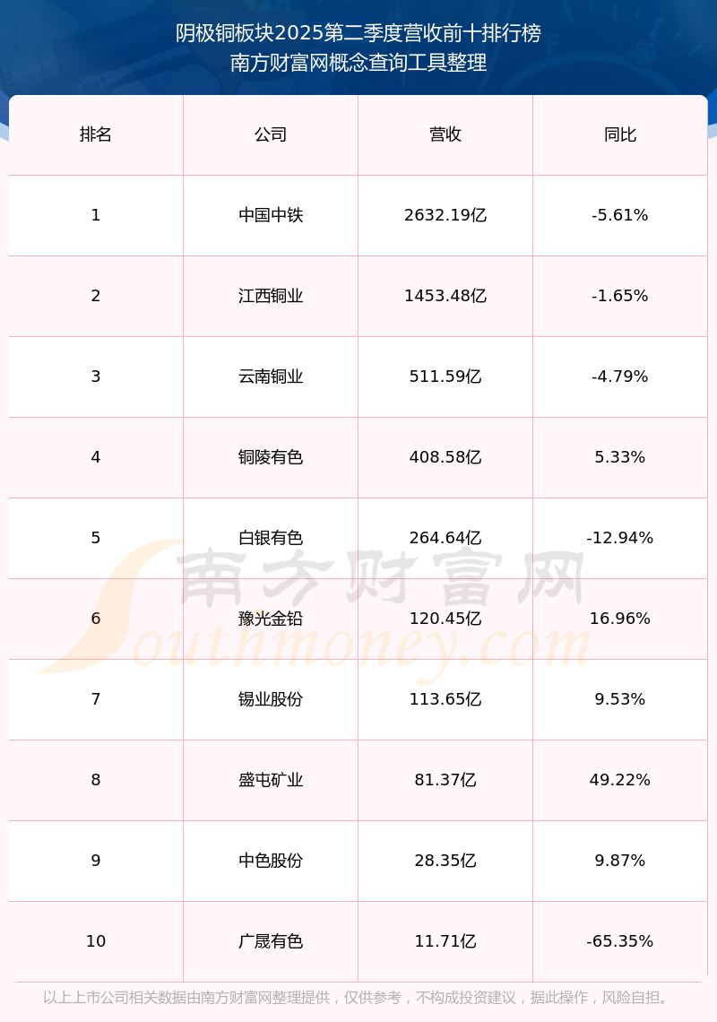 按照南方財富網(wǎng)概念查詢工具統(tǒng)計,該股所屬板塊為陰極銅板塊,該板塊共有12只股票,江西銅業(yè)2025第二季度營收在該板塊中排名為第2名,該板塊2025第二季度營收排名前十的股票如下表: