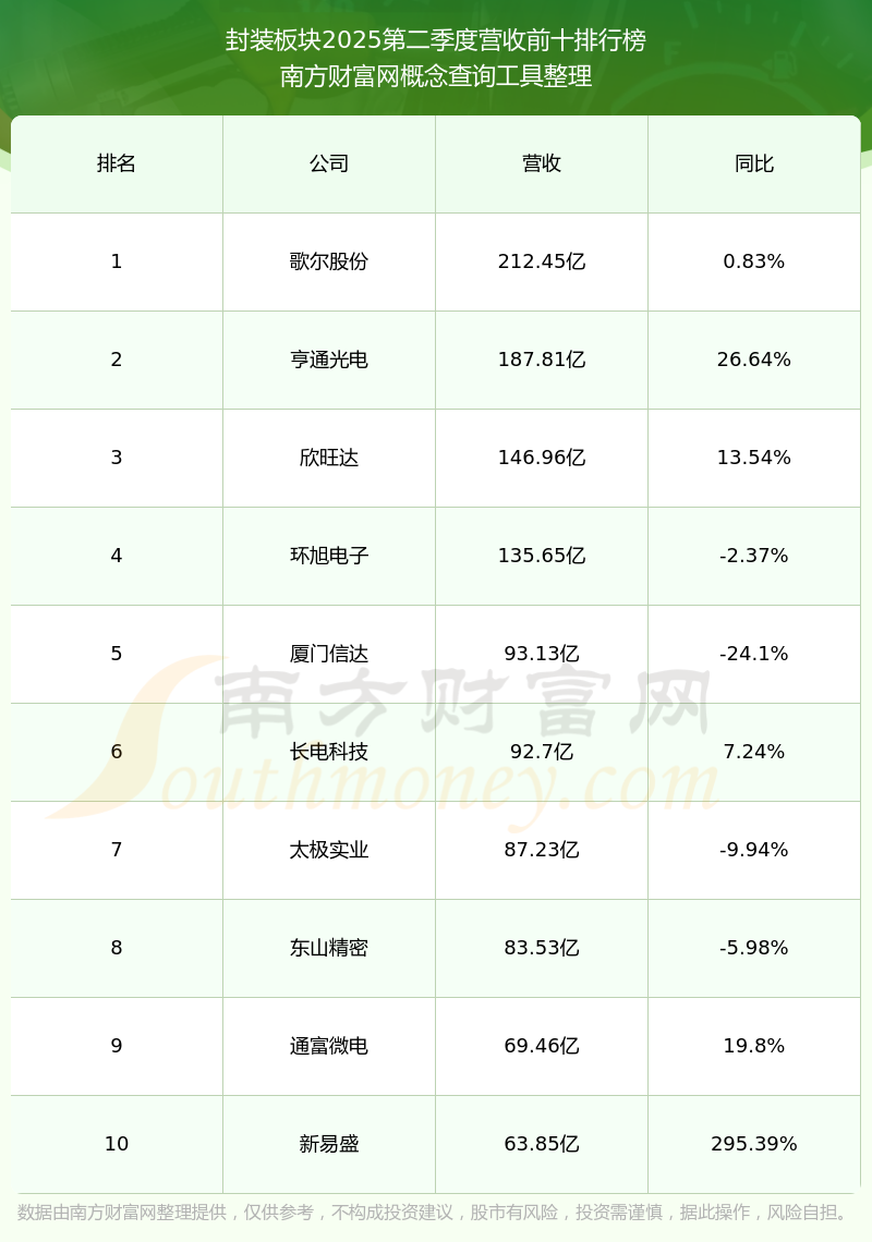 按照南方財(cái)富網(wǎng)概念查詢工具統(tǒng)計(jì),該股所屬板塊為封裝板塊,該板塊共有53只股票,甬矽電子2025第二季度營(yíng)收在該板塊中排名為第53名,該板塊2025第二季度營(yíng)收排名前十的股票如下表: