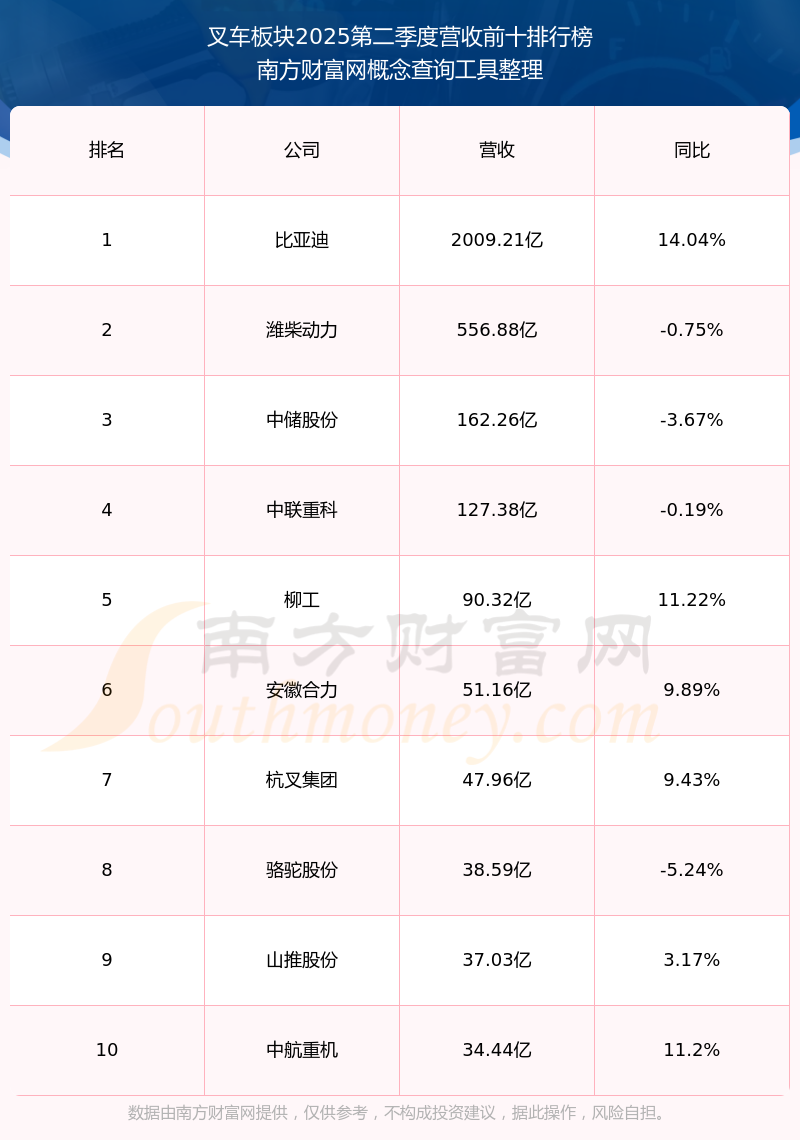 按照南方財(cái)富網(wǎng)概念查詢工具統(tǒng)計(jì),該股所屬板塊為叉車板塊,該板塊共有23只股票,安徽合力2025第二季度營(yíng)收在該板塊中排名為第6名,該板塊2025第二季度營(yíng)收排名前十的股票如下表: