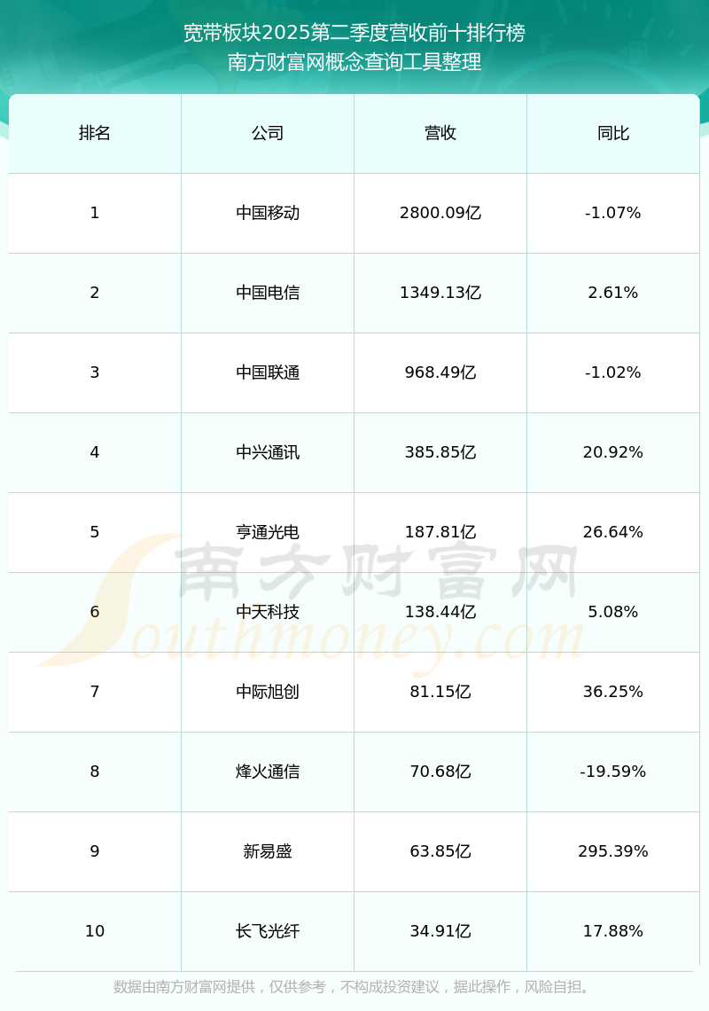 按照南方財富網(wǎng)概念查詢工具統(tǒng)計,該股所屬板塊為寬帶板塊,該板塊共有18只股票,瑞斯康達2025第二季度營收在該板塊中排名為第18名,該板塊2025第二季度營收排名前十的股票如下表: