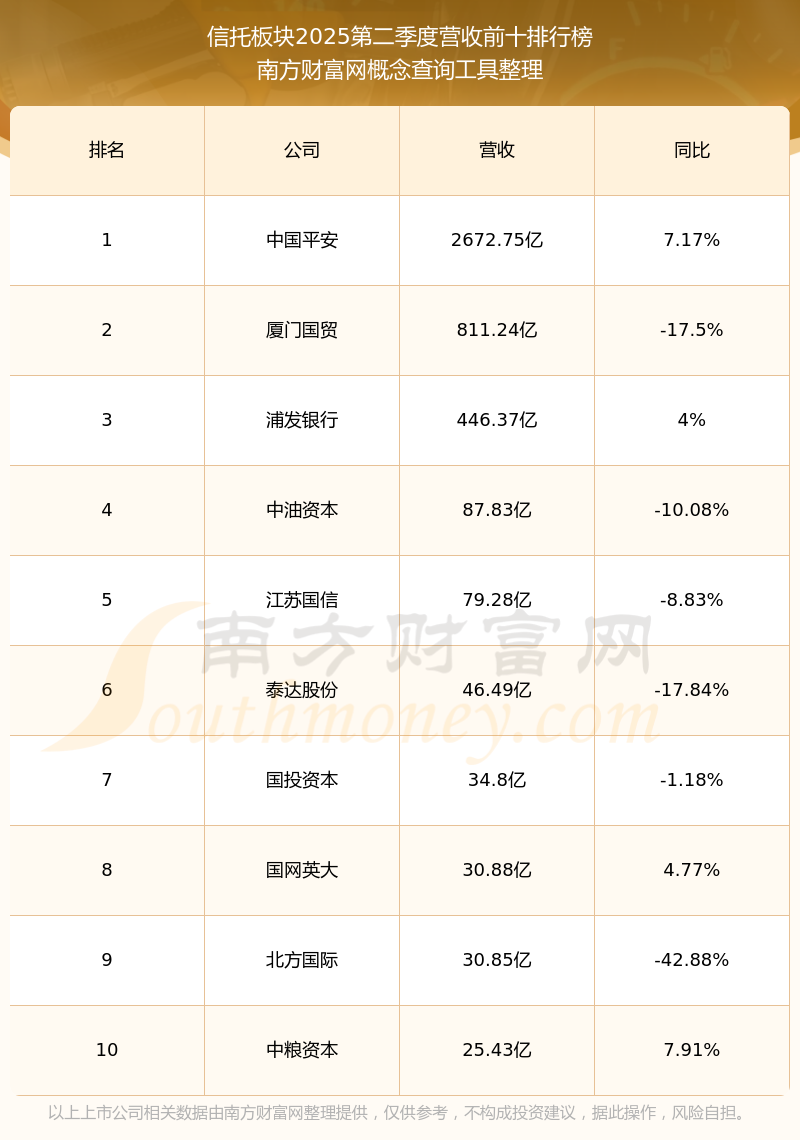 按照南方財(cái)富網(wǎng)概念查詢工具統(tǒng)計(jì),該股所屬板塊為信托板塊,該板塊共有27只股票,陸家嘴2025第二季度營收在該板塊中排名為第27名,該板塊2025第二季度營收排名前十的股票如下表: