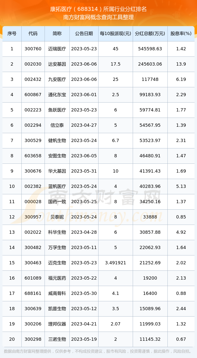 二、康拓醫(yī)療688314行業(yè)分紅排名