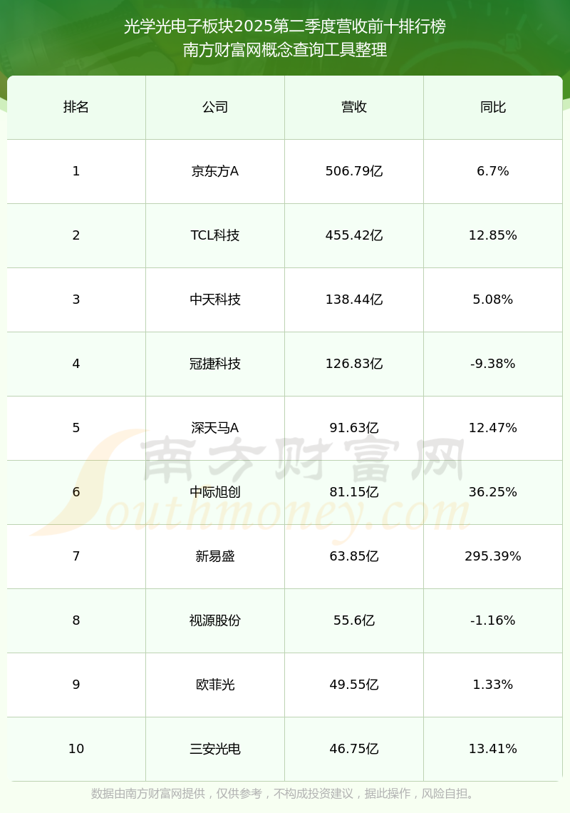 按照南方財富網(wǎng)概念查詢工具統(tǒng)計,該股所屬板塊為光學光電子板塊,該板塊共有133只股票,彩虹股份2025第二季度營收在該板塊中排名為第17名,該板塊2025第二季度營收排名前十的股票如下表: