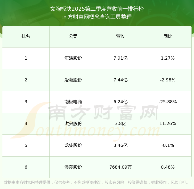 按照南方財(cái)富網(wǎng)概念查詢工具統(tǒng)計(jì),該股所屬板塊為文胸板塊,該板塊共有6只股票,愛慕股份2025第二季度營(yíng)收在該板塊中排名為第2名,該板塊2025第二季度營(yíng)收排名前十的股票如下表: