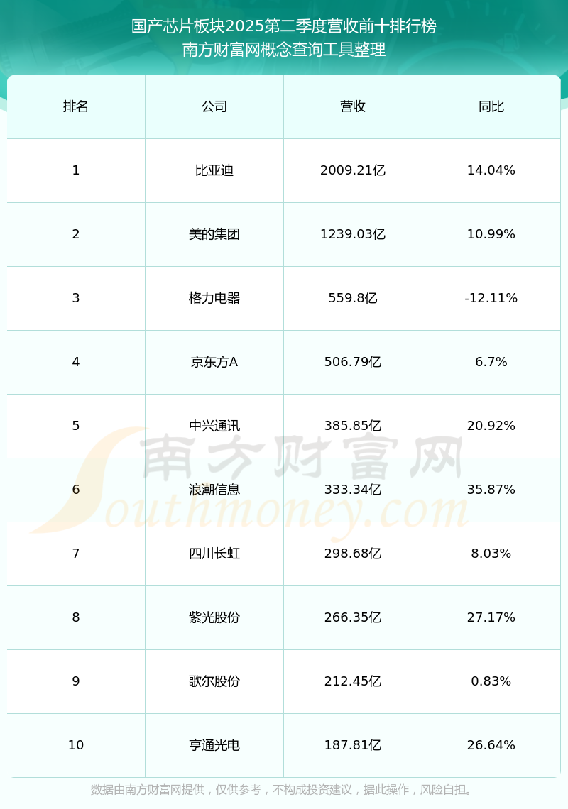 按照南方財富網(wǎng)概念查詢工具統(tǒng)計,該股所屬板塊為國產(chǎn)芯片板塊,該板塊共有391只股票,晶方科技2025第二季度營收在該板塊中排名為第229名,該板塊2025第二季度營收排名前十的股票如下表: