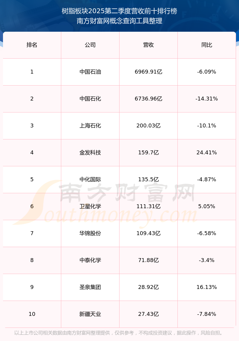 按照南方財(cái)富網(wǎng)概念查詢工具統(tǒng)計(jì),該股所屬板塊為樹脂板塊,該板塊共有33只股票,上海石化2025第二季度營收在該板塊中排名為第3名,該板塊2025第二季度營收排名前十的股票如下表: