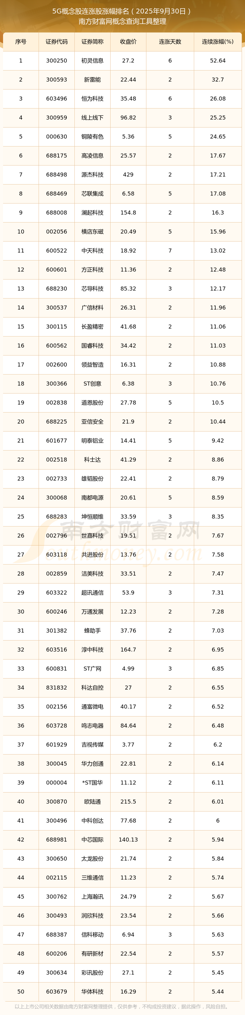 根據(jù)南方財(cái)富網(wǎng)概念查詢(xún)工具數(shù)據(jù)統(tǒng)計(jì),截止2025年9月30日收盤(pán),5G概念股共有188只個(gè)股實(shí)現(xiàn)連漲。其中連續(xù)漲幅較大的個(gè)股有初靈信息、新雷能、恒為科技等,連續(xù)漲幅分別為52.64%、32.70%、26.08%。