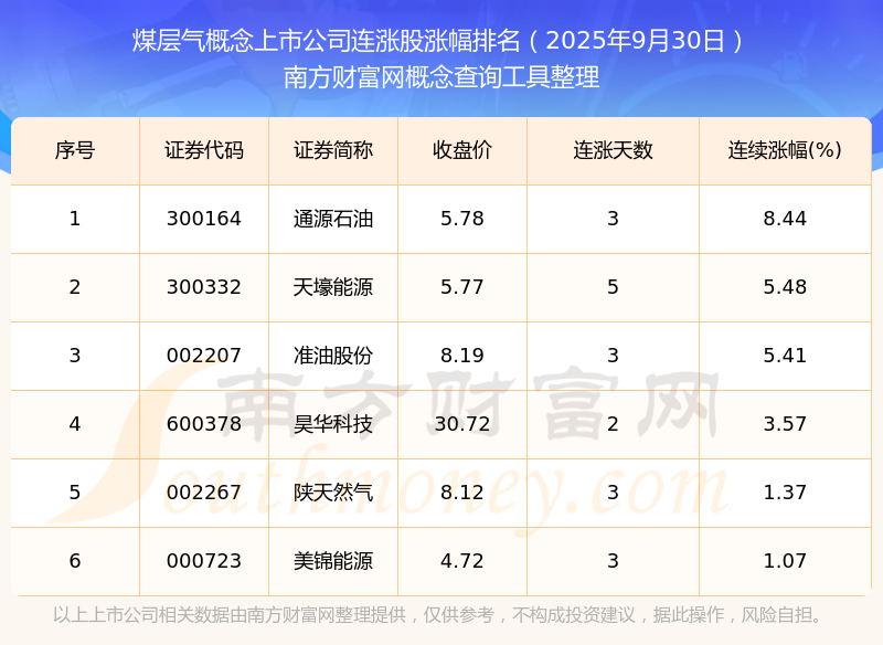 根據(jù)南方財富網(wǎng)概念查詢工具數(shù)據(jù)統(tǒng)計,截止2025年9月30日收盤,煤層氣概念上市公司共有6只個股實現(xiàn)連漲。其中連續(xù)漲幅較大的個股有通源石油、天壕能源、準油股份等,連續(xù)漲幅分別為8.44%、5.48%、5.41%。