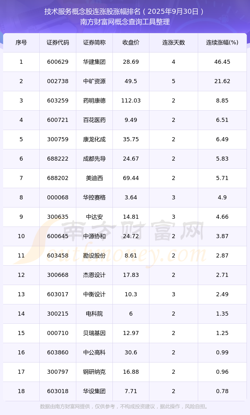 2025年9月30日技術(shù)服務(wù)概念股連漲股漲幅排名
