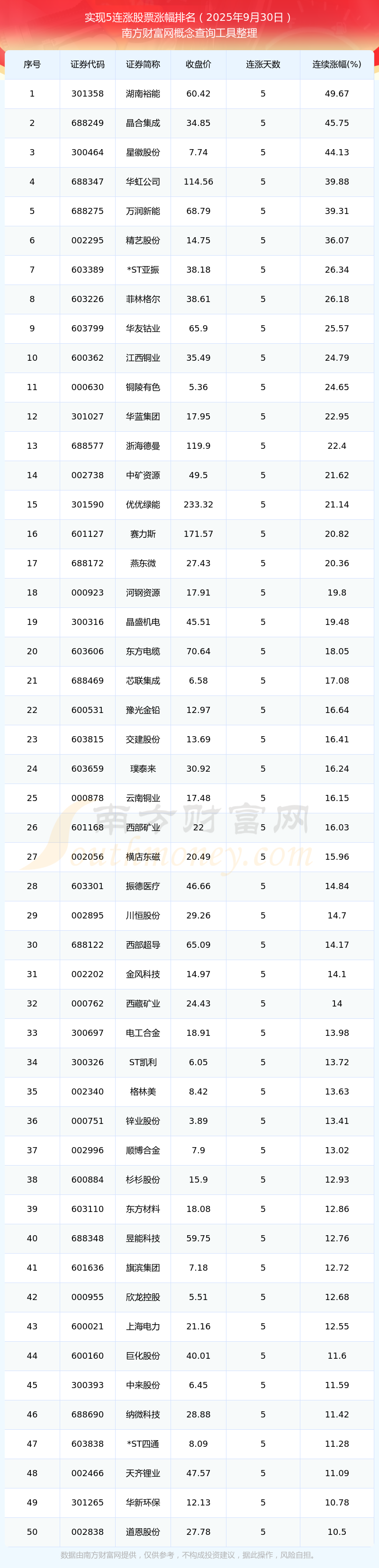 2025年9月30日實現(xiàn)5連漲股票漲幅排名