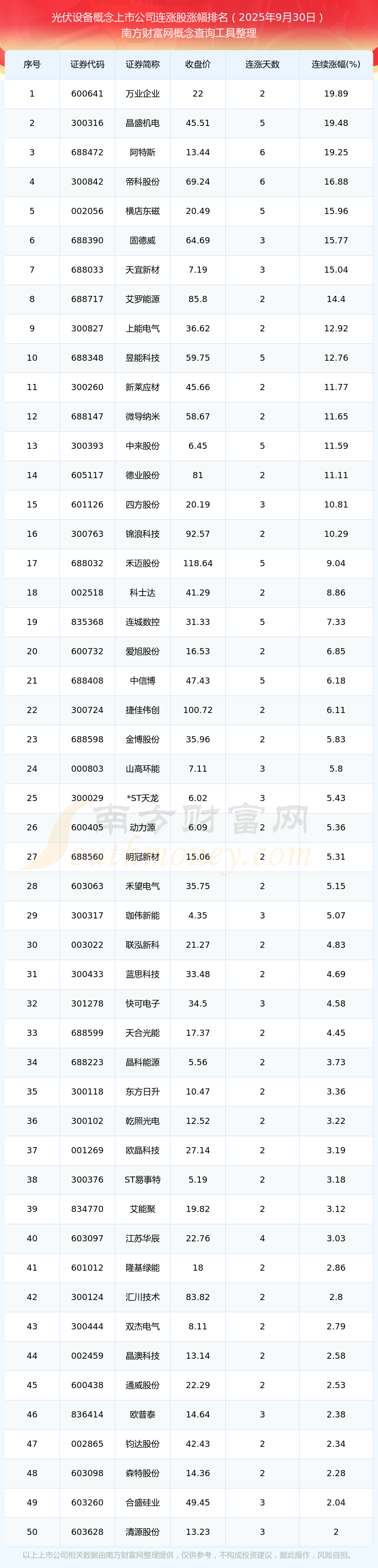 2025年9月30日光伏設(shè)備概念上市公司連漲股漲幅排名