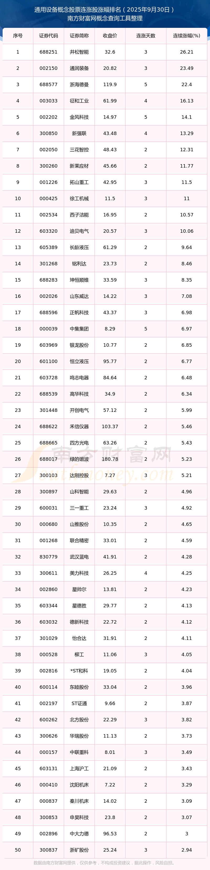 2025年9月30日通用設備概念股票連漲股票漲幅排名