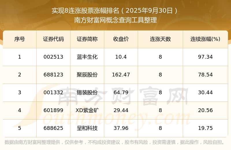 2025年9月30日實(shí)現(xiàn)8連漲股票漲幅排名
