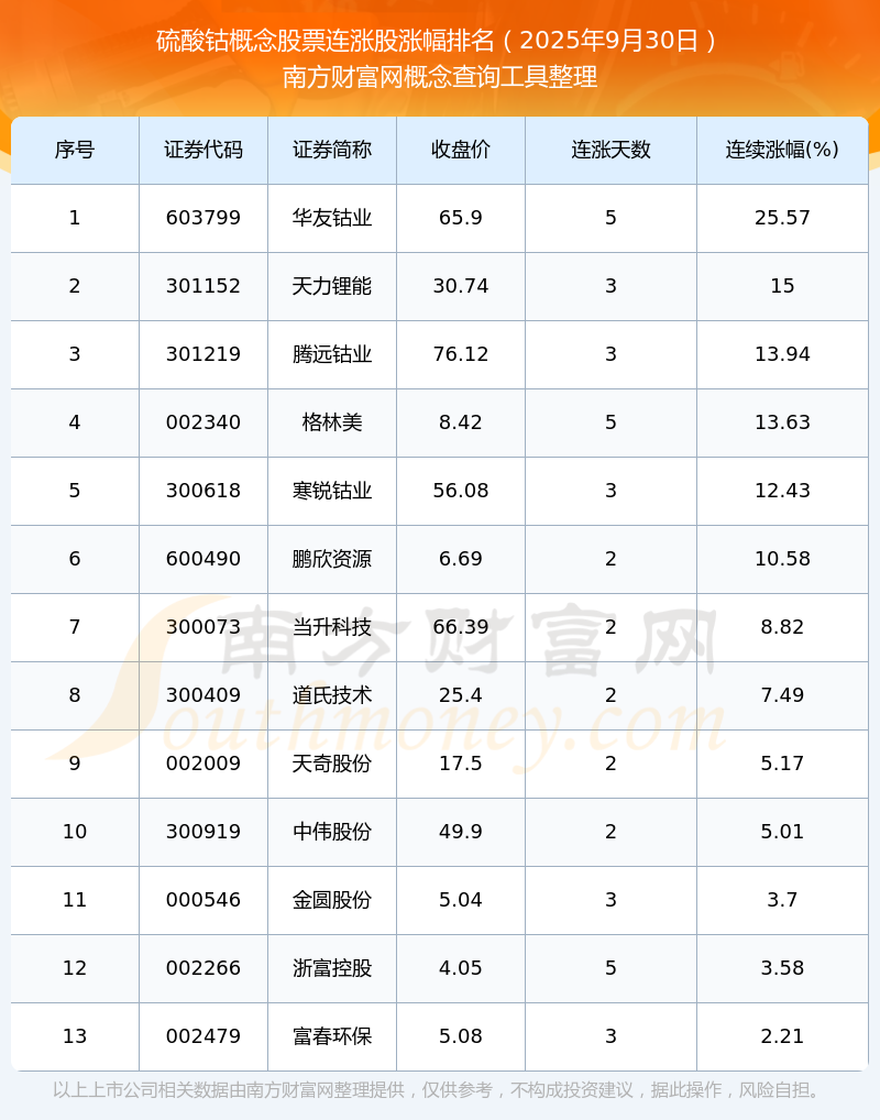 2025年9月30日硫酸鈷概念股票連漲股漲幅排名