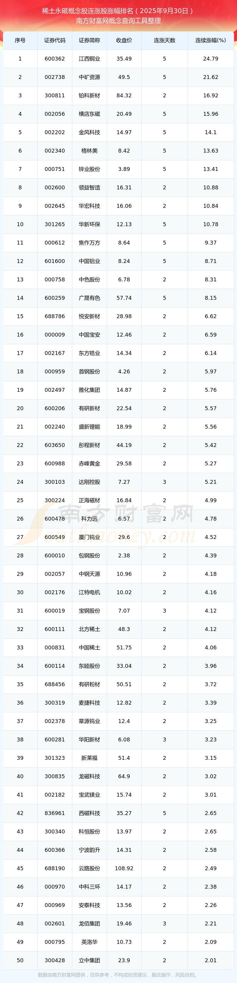 根據(jù)南方財(cái)富網(wǎng)概念查詢工具數(shù)據(jù)統(tǒng)計(jì),截止2025年9月30日收盤,稀土永磁概念股共有59只個(gè)股實(shí)現(xiàn)連漲。其中連續(xù)漲幅較大的個(gè)股有江西銅業(yè)、中礦資源、鉑科新材等,連續(xù)漲幅分別為24.79%、21.62%、16.92%。