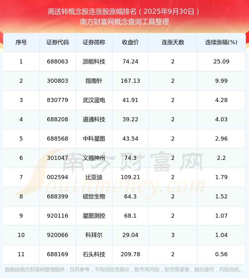 2025年9月30日高送轉(zhuǎn)概念股連漲股漲幅排名