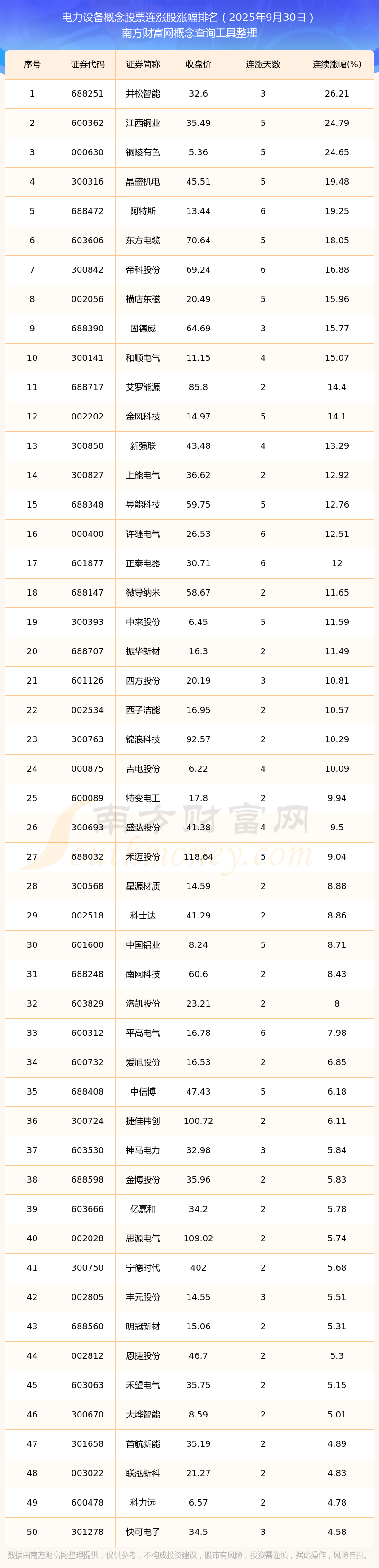 2025年9月30日電力設(shè)備概念股票連漲股漲幅排名