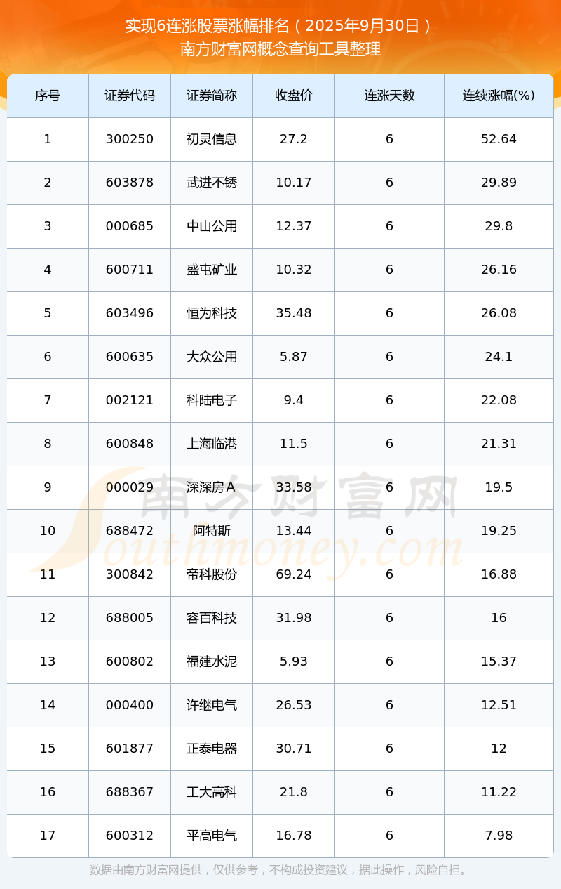 2025年9月30日實(shí)現(xiàn)6連漲股票漲幅排名