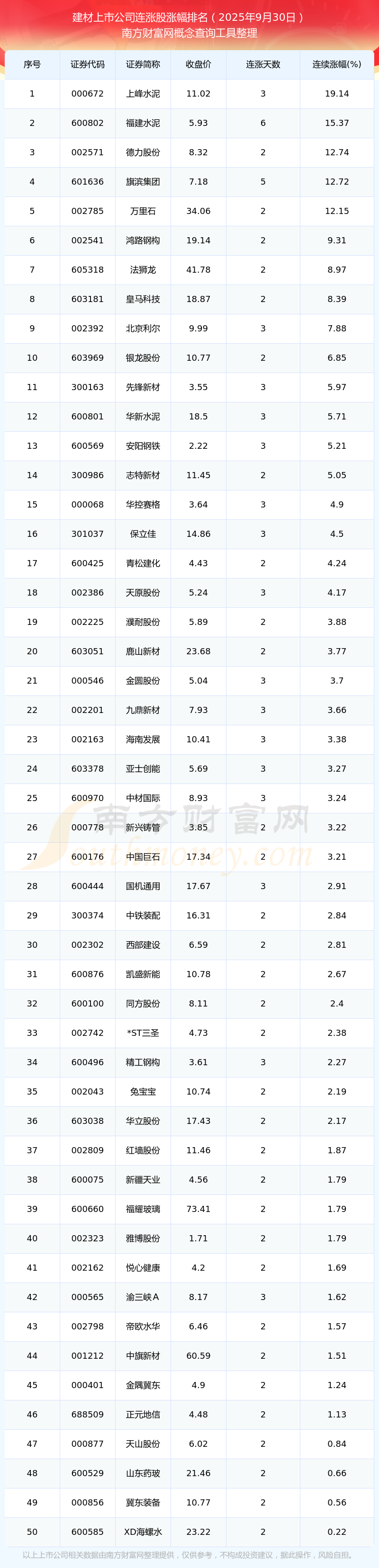 2025年9月30日建材上市公司連漲股票漲幅排名