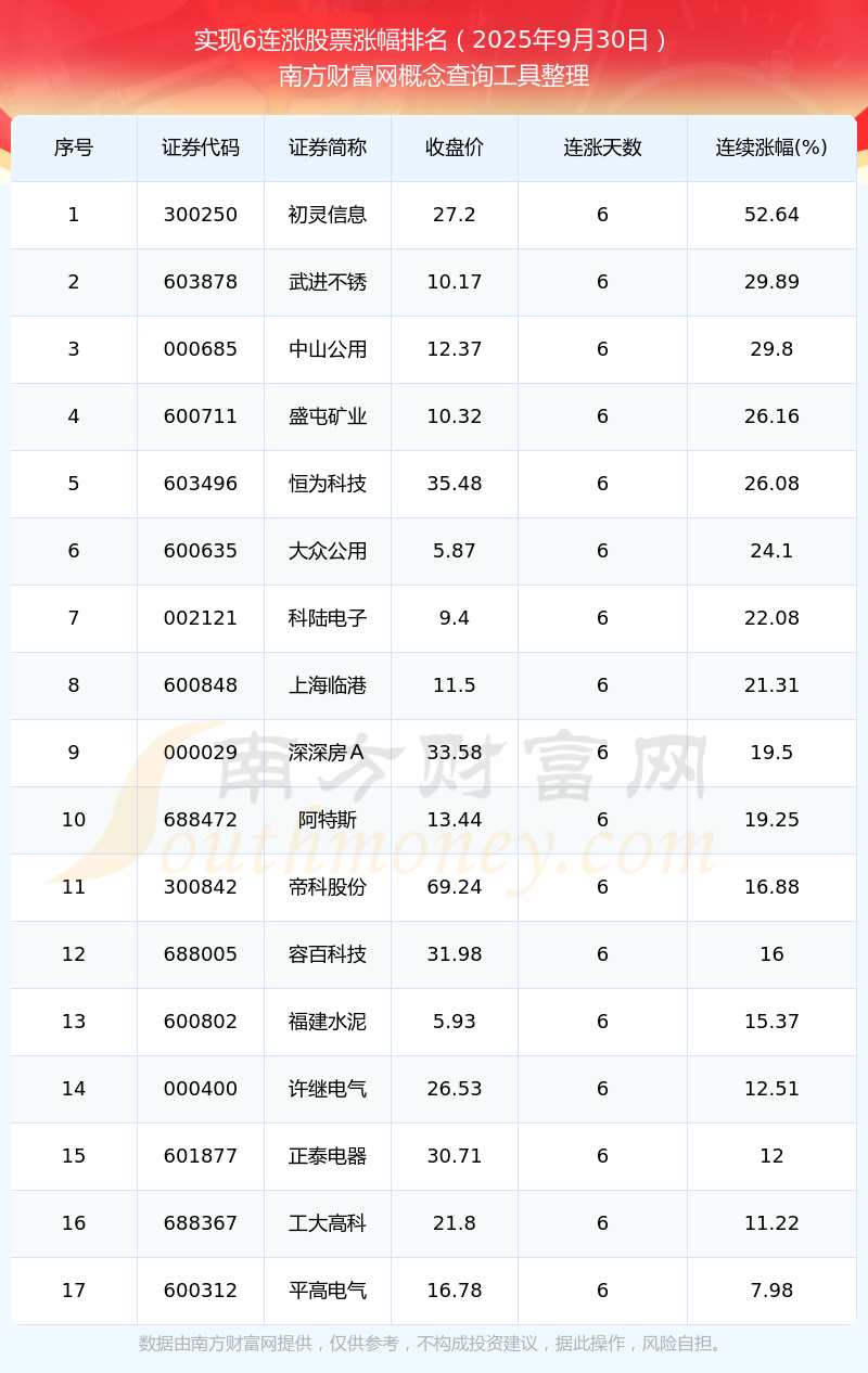 2025年9月30日實現(xiàn)6連漲股票漲幅排名